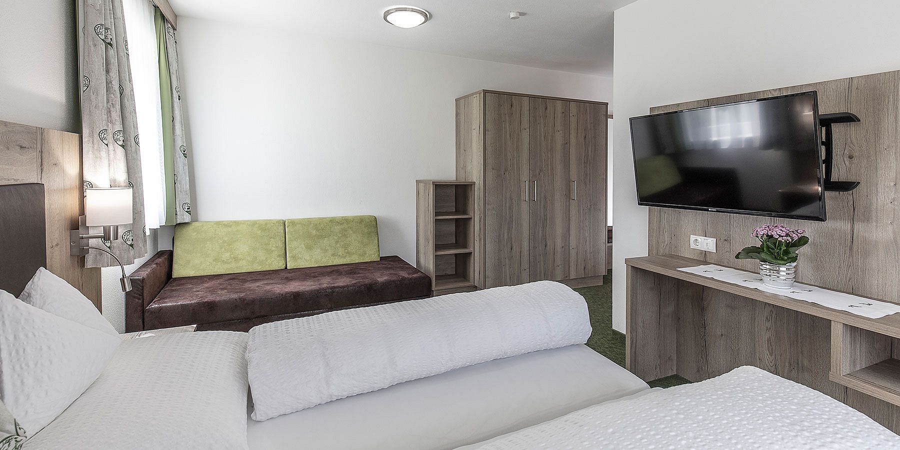 Our large apartment has two double rooms with sofa bed, two bathrooms with shower/WC, a separate kitchen, a living area with sofa and dining area and a balcony with a view of the Ötztal Alps.